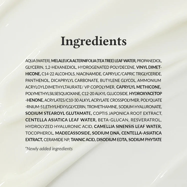 Ingredients: Aqua (Water), Melaleuca Alternifolia (Tea Tree) Leaf Water, Propanediol, Glycerin, 1,2-Hexanediol, Hydrogenated Polydecene, Vinyl Dimethicone, C14-22 Alcohols, Niacinamide, Caprylic/Capric Triglyceride, Panthenol, Dicaprylyl Carbonate, Butylene Glycol, Ammonium Acryloyldimethyltaurate/Vp Copolymer, Caprylyl Methicone, Polymethylsilsesquioxane, C12-20 Alkyl Glucoside, Hydroxyacetophenone, Acrylates/C10-30 Alkyl Acrylate Crosspolymer, Polyquaternium-51, Ethylhexylglycerin, Tromethamine, Sodium Hyaluronate, Sodium Stearoyl Glutamate, Coptis Japonica Root Extract, Centella Asiatica Leaf Water, Beta-Glucan, Resveratrol, Hydrolyzed Hyaluronic Acid, Camellia Sinensis Leaf Water, Tocopherol, Madecassoside, Sodium Dna, Centella Asiatica Extract, Ceramide Np, Tannic Acid, Disodium Edta, Sodium Phytate
